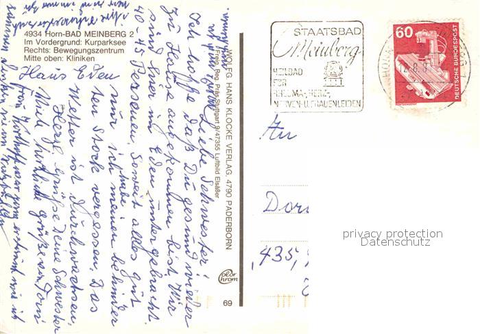 72850919 alte Postkarte Horn-Bad Meinberg Kurparksee Bewegungszentrum Kliniken postalisch gelaufen Erhaltung siehe scans [NatalD47] KatCode: 11110005766032