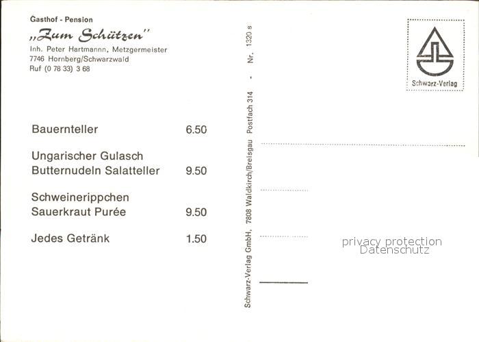 71986306 Hornberg Schwarzwald Gasthof Pension Zum Schuetzen postalisch nicht gelaufen Erhaltung siehe scans KatCode: 11110008317051