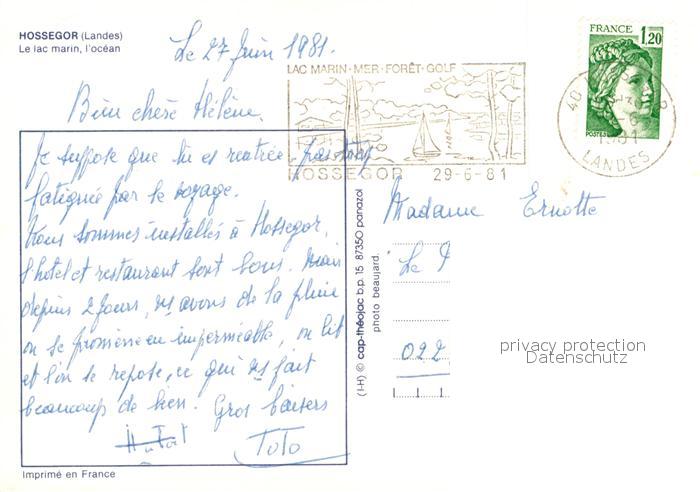13548376 carte postale Hossegor Soorts Landes Lac marin et l’océan vue aérienne postalisch gelaufen Erhaltung siehe scans [FriedD77] KatCode: 11170040140304