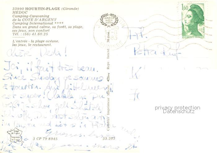 13742910 Hourtin Plage 33 Camping Caravaning de la Côte d Argent Plage postalisch gelaufen Erhaltung siehe scans [FriedD77] carte postale Frie Katcode 11170033433203