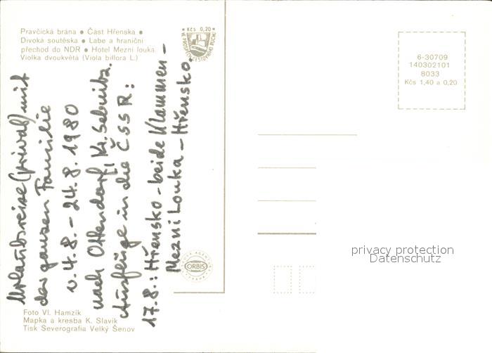 Hrensko Pravcicka brana Cast Hrenska Divoka souteska Labe a hranicni prechod do NDR Hotel Mezni louka Violka dvoukveta postalisch nicht gelaufen Erhaltung siehe scans