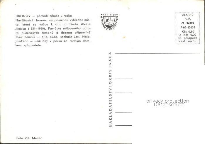 Hronov Denkmal Aloise Jiraska postalisch nicht gelaufen Erhaltung siehe scans