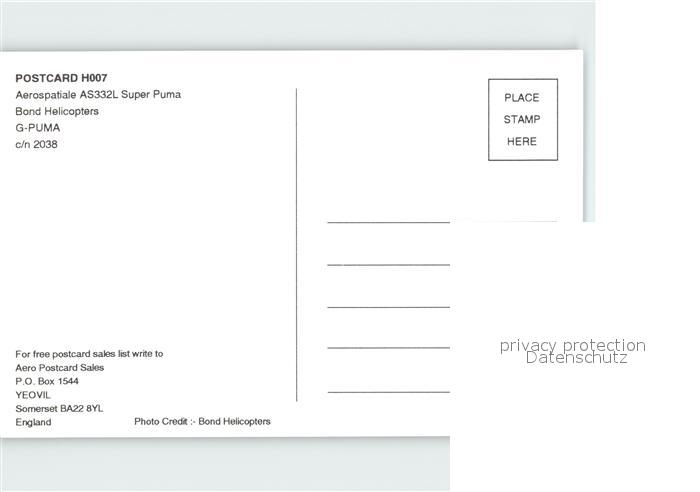 Hubschrauber Helikopter Bond Helicopters Aerospatiale AS332L Super Puma G-PUMA c/n 2038 postalisch nicht gelaufen Erhaltung siehe scans