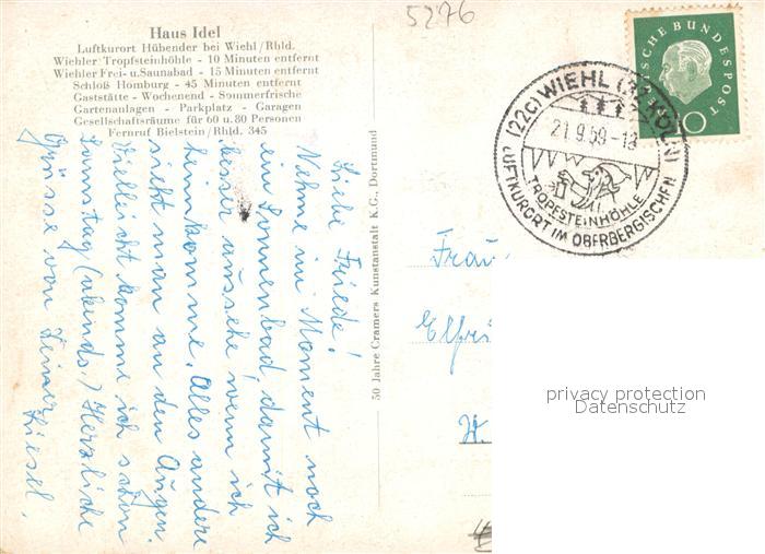 73698716 alte Postkarte Huebender Haus Idel Liegewiese Garten Wochenendhaus Schloss Homburg Wiehl Freibad Tropfsteinhoehle postalisch gelaufen Erhaltung siehe scans [FriedD77] KatCode: 11110005374048