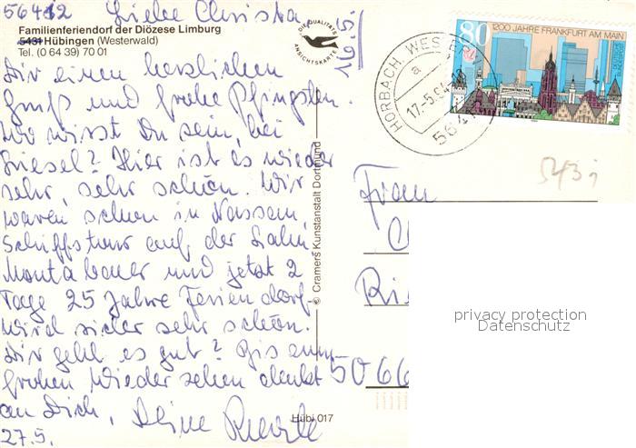 73042366 alte Postkarte Huebingen Familienferiendorf der Dioezese Limburg im Westerwald postalisch gelaufen Erhaltung siehe scans [FriedD77] KatCode: 11110007143036