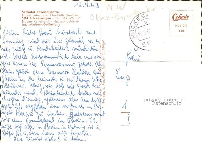 72227294 alte Postkarte Hueckeswagen Seehotel Bevertalsperre Fliegeraufnahme postalisch gelaufen Erhaltung siehe scans KatCode: 11110005374016