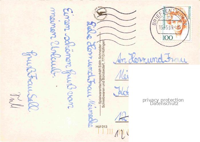 74042696 Huefingen Schwarzwald-Baar-Kreis BW Partie am Rathaus Brunnen Altstadt Gewerbe-Kanal Kirche Hauptstrasse Windsurfen postalisch gelaufen Erhaltung siehe scans [FriedD77] alte Postkarte Frie Katcode 11110008326027