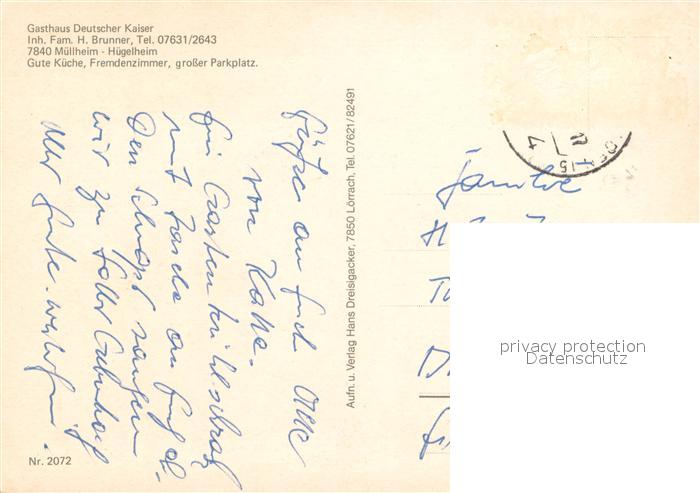 73660562 alte Postkarte Huegelheim Gasthaus Deutscher Kaiser Landschaftspanorama Weinberge postalisch gelaufen Erhaltung siehe scans [FriedD77] KatCode: 11110008315074