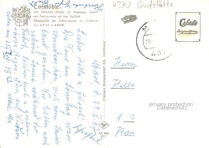 73710267 alte Postkarte Huels Marl Gaststaette Loemuehle Schwimmbad Garten Muehlengraben postalisch gelaufen Erhaltung siehe scans [LiesaD40] KatCode: 11110005562024
