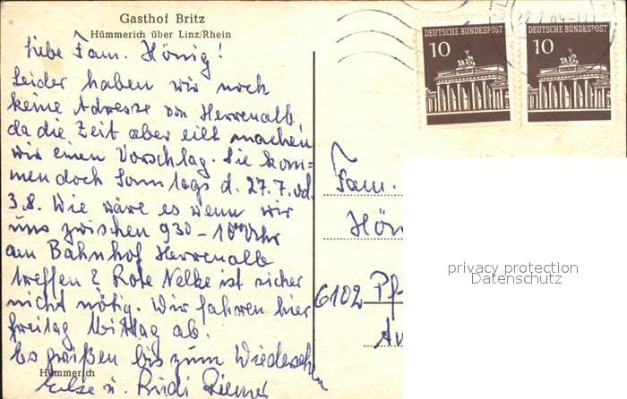 72474797 alte Postkarte Huemmerich Westerwald Gasthof Britz postalisch gelaufen Erhaltung siehe scans KatCode: 11110007138030
