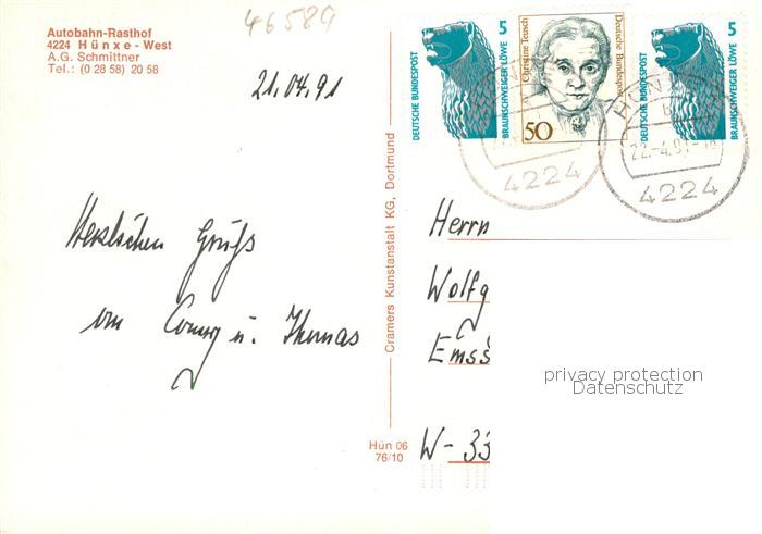 73855304 alte Postkarte Huenxe Autobahn Rasthof Luftaufnahme Restaurant postalisch gelaufen Erhaltung siehe scans [FriedD77] KatCode: 11110005170016