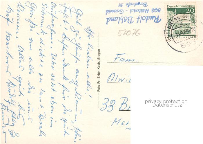73853601 alte Postkarte Huettental Siegen Stadtmitte Kath Wensch Kirche Grosser Wensch Teich Freibad Schwanenteich Anlagen postalisch gelaufen Erhaltung siehe scans [WerneD78] KatCode: 11110005970040