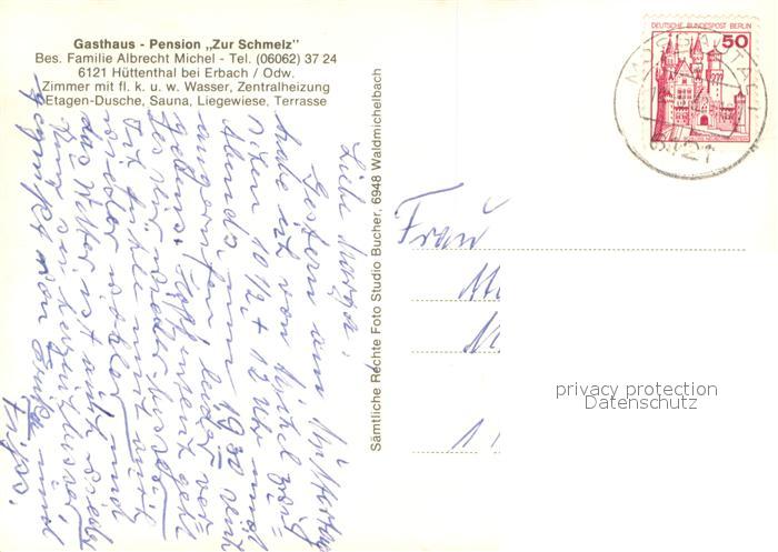73726367 alte Postkarte Huettenthal Mossautal Gasthaus Pension Zur Schmelz Restaurant Landschaftspanorama postalisch gelaufen Erhaltung siehe scans [FriedD77] KatCode: 11110006437012