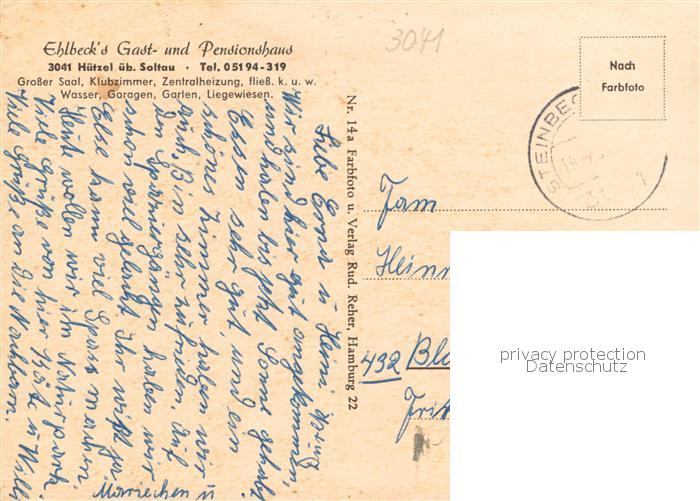 73762752 alte Postkarte Huetzel Ehlbecks Gasthaus Gaststube postalisch gelaufen Erhaltung siehe scans [FriedD77] KatCode: 11110003358002