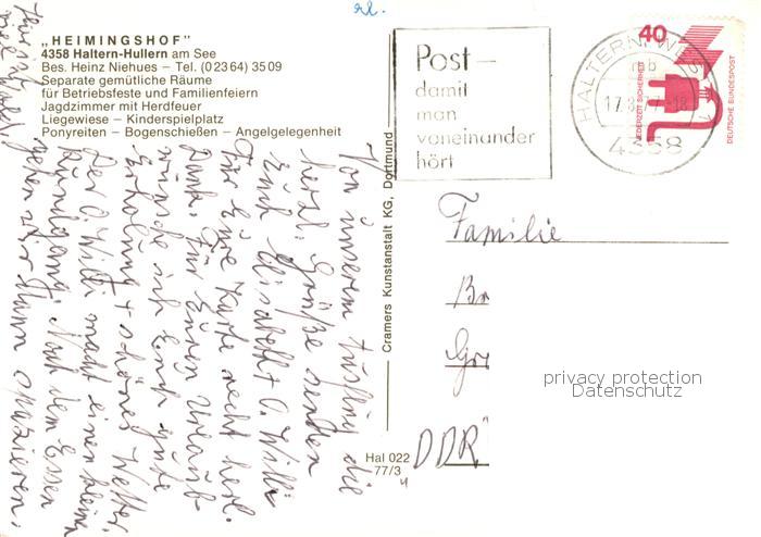 73787384 alte Postkarte Hullern Hotel Restaurant Heimingshof Kaminzimmer Stuebchen Luftfoto postalisch gelaufen Erhaltung siehe scans [FriedD77] KatCode: 11110005562016