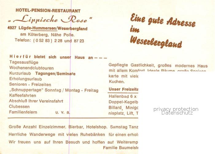 73724668 Hummersen Hotel Pension Restaurant Lippische Rose Hallenbad Tennisplatz postalisch nicht gelaufen Werbekarte (keine Postkarte) Erhaltung siehe scans [FriedD77] KatCode: 11110005766052