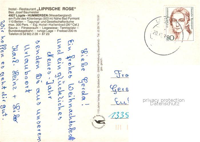 73541336 alte Postkarte Hummersen Hotel Restaurant Lippische Rose postalisch gelaufen Erhaltung siehe scans [KathaD81] KatCode: 11110005766052