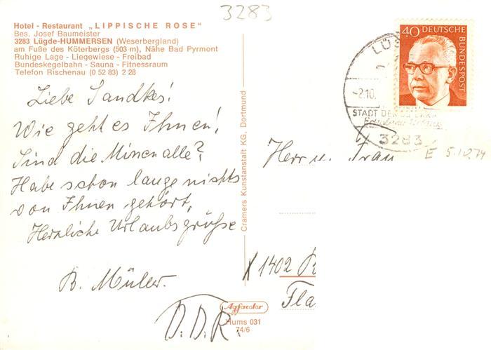 73893219 alte Postkarte Hummersen Hotel Restaurant Lippische Rose Gastraeume Gartenschach postalisch gelaufen Erhaltung siehe scans [WerneD78] KatCode: 11110005766052