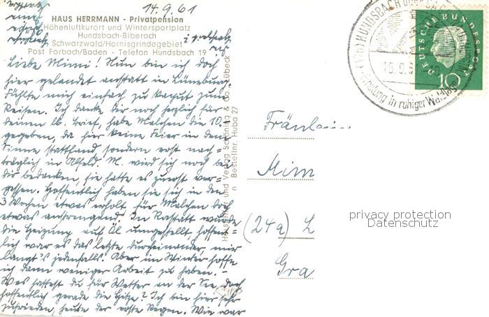 73775719 alte Postkarte Hundsbach Forbach Pension Gaestehaus Haus Herrmann im Schwarzwald postalisch gelaufen Erhaltung siehe scans [FriedD77] KatCode: 11110008216013