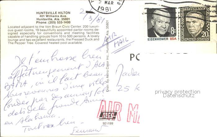 72486922 old postcard Huntsville Alabama Hilton Hotel postalisch gelaufen Erhaltung siehe scans KatCode: 14140010000000