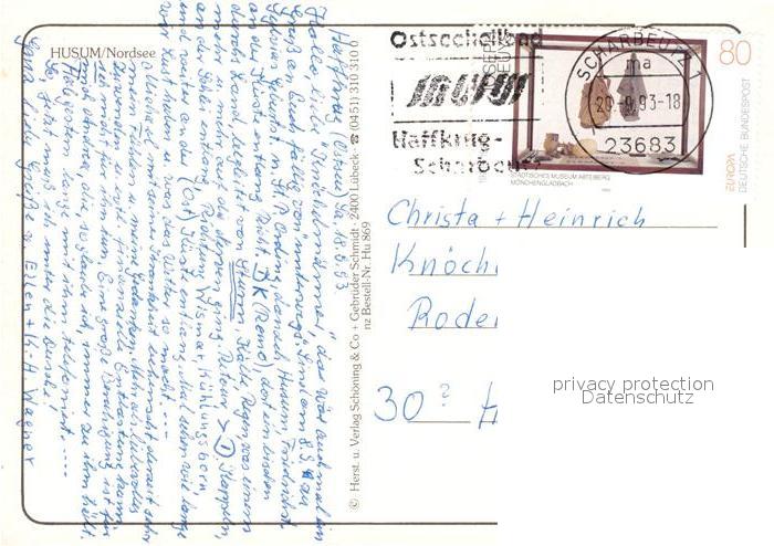 73294216 alte Postkarte Husum Nordfriesland Brunnen Hafen Fischkutter Haeuserpartie postalisch gelaufen Erhaltung siehe scans [FriedD77] KatCode: 11110001054056