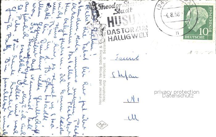 72198098 alte Postkarte Husum Nordfriesland Markt Fliegeraufnahme Schloss Park Hafen Gross Str Theodor Storm Denkmal Norderstr Seedeich Lageplan postalisch gelaufen Erhaltung siehe scans KatCode: 11110001054056