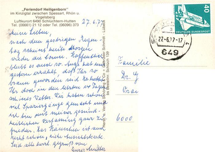 73888187 alte Postkarte Hutten Schluechtern Feriendorf Heiligenborn im Kinzigtal postalisch gelaufen Erhaltung siehe scans [FriedD77] KatCode: 11110006435025