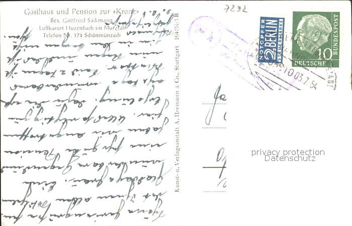 31702433 alte Postkarte Huzenbach Gasthaus-Pension zur Krone Bahnpost postalisch gelaufen Erhaltung siehe scans KatCode: 11110008237004