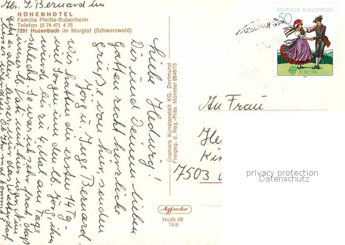 72915578 alte Postkarte Huzenbach Hoehenhotel postalisch gelaufen Erhaltung siehe scans [NatalD47] KatCode: 11110008237004