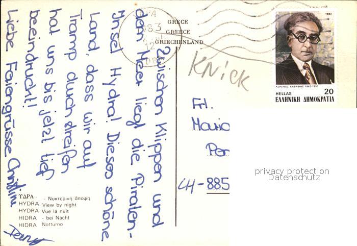 old postcard Hydra Greece Hafen Nachtaufnahme postalisch gelaufen Erhaltung siehe scans [AndreD76 kt121box]
