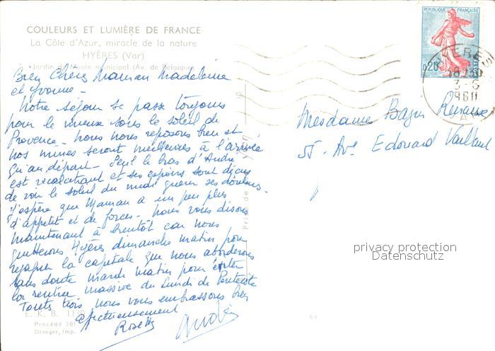 12138474 carte postale Hyeres Jardin du Musee municipal Avenue de Belgique postalisch gelaufen Erhaltung siehe scans KatCode: 11170083283069