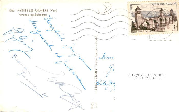 13484622 carte postale Hyeres les Palmiers Avenue de Belgique postalisch gelaufen Erhaltung siehe scans [FriedD77] KatCode: 11170083283069