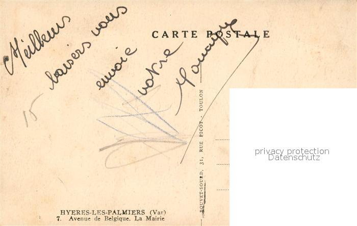 13480137 Hyeres les Palmiers Avenue de Belgique Mairie postalisch nicht gelaufen Erhaltung siehe scans [LiesaD40] KatCode: 11170083283069