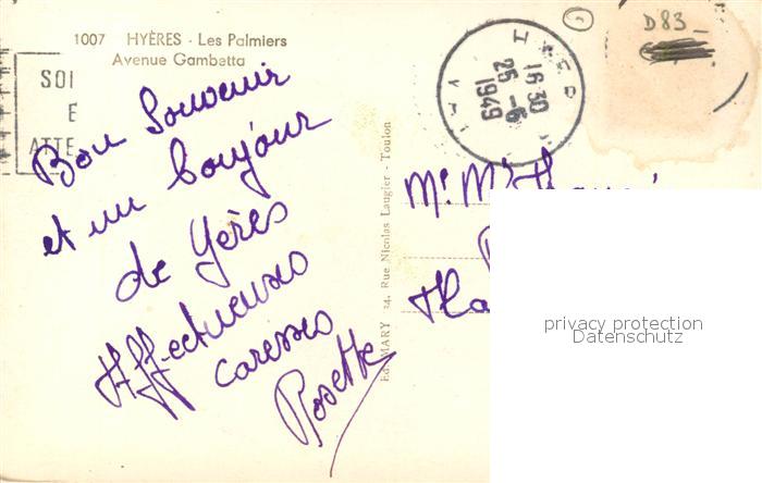 13553317 carte postale Hyeres les Palmiers Avenue Gambetta postalisch gelaufen Erhaltung siehe scans [FriedD77] KatCode: 11170083283069