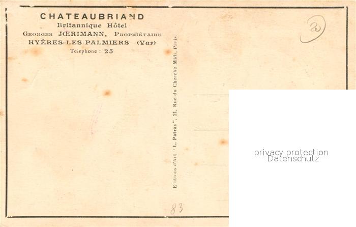 13484602 Hyeres les Palmiers Britannique Hotel des palmiers postalisch nicht gelaufen Erhaltung siehe scans [FriedD77] KatCode: 11170083283069