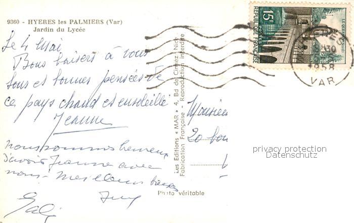 13586224 Hyeres les Palmiers Jardin du Lycee postalisch gelaufen Erhaltung siehe scans [WerneD78] carte postale Wern Katcode 11170083283069