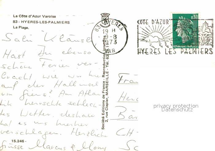 12705383 carte postale Hyeres les Palmiers Plage Strand postalisch gelaufen Erhaltung siehe scans [FriedD77] KatCode: 11170083283069