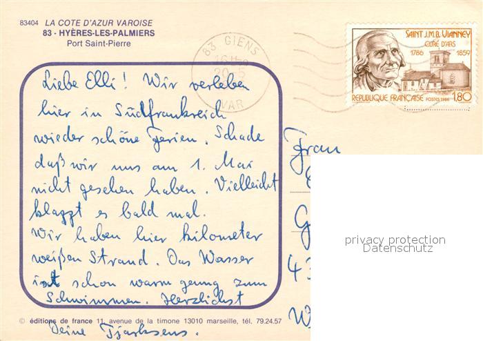 13359472 carte postale Hyeres les Palmiers Port Saint Pierre postalisch gelaufen Erhaltung siehe scans [WerneD78] KatCode: 11170083283069