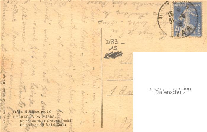 13553318 carte postale Hyeres les Palmiers Ruines du vieux Chateau féodal postalisch gelaufen Erhaltung siehe scans [FriedD77] KatCode: 11170083283069
