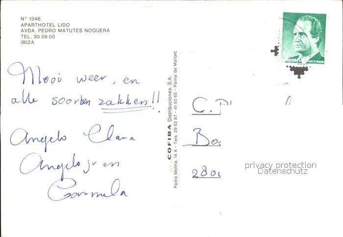 old postcard Ibiza Islas Baleares Aparthotel Lido Gastraum Zimmer Strand postalisch gelaufen Erhaltung siehe scans