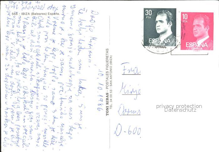 old postcard Ibiza Islas Baleares Landkarte Sonnenuntergang Hafen Segelboot postalisch gelaufen Erhaltung siehe scans