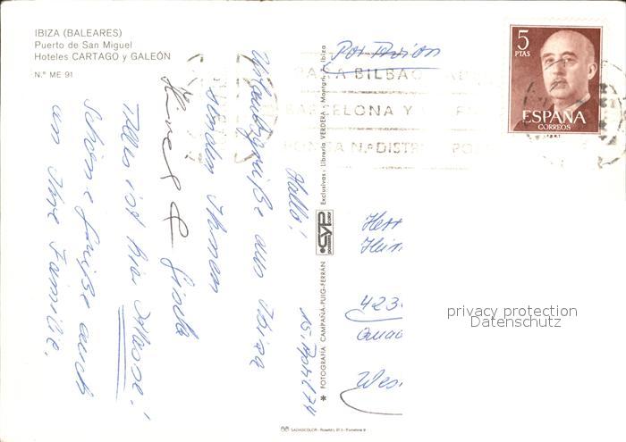 old postcard Ibiza Islas Baleares Puerto de San Miguel Hoteles Cartago Galeon postalisch gelaufen Erhaltung siehe scans