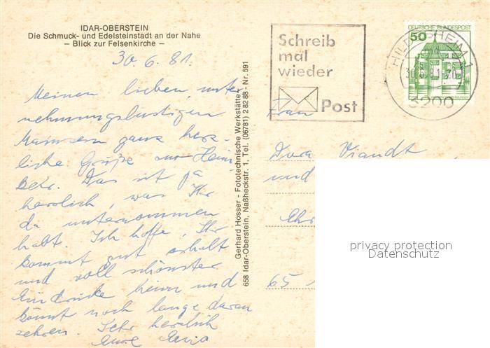 73181129 alte Postkarte Idar-Oberstein Felsenkirche postalisch gelaufen Erhaltung siehe scans [NatalD47] KatCode: 11110007134045