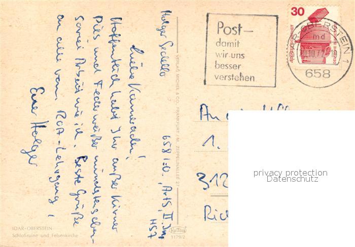 73081927 alte Postkarte Idar-Oberstein Uferpartie an der Nahe Schlossruine Felsenkirche postalisch gelaufen Erhaltung siehe scans [FriedD77] KatCode: 11110007134045