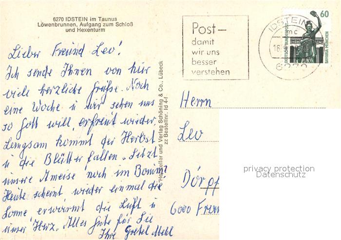 73206590 alte Postkarte Idstein Loewenbrunnen Aufgang zum Schloss Hexenturm postalisch gelaufen Erhaltung siehe scans [KathaD81] KatCode: 11110006439008