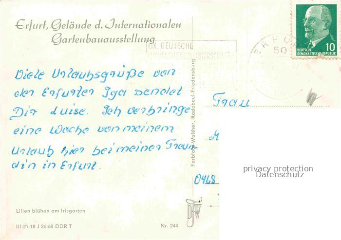 74056901 alte Postkarte IGA Gartenbauaustellung International Erfurt DDR Lilien bluehen postalisch gelaufen Erhaltung siehe scans [SanaeD93] KatCode: 22100000000100