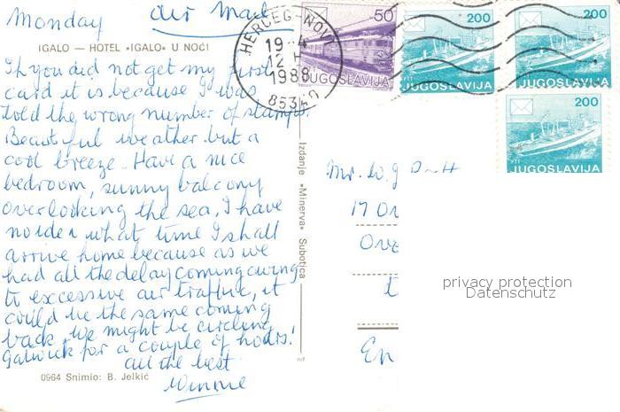 old postcard Igalo Hotel Igalo u noc postalisch gelaufen Erhaltung siehe scans [WerneD78]