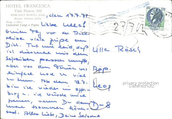 old postcard Igea Marina Hotel Francesca Strand postalisch gelaufen Erhaltung siehe scans