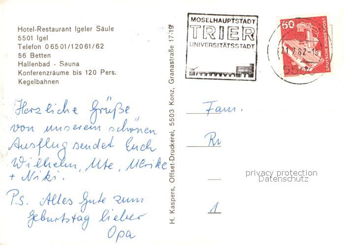 73643603 alte Postkarte Igel Trier Hotel Restaurant Igeler Saeule Gaststube Bar Kegelbahn postalisch gelaufen Erhaltung siehe scans [WerneD78] KatCode: 11110007235051