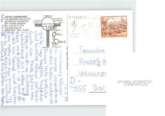 72256680 alte Postkarte Igls Tirol Hotel Sonnenhof postalisch gelaufen Erhaltung siehe scans KatCode: 11390332070101